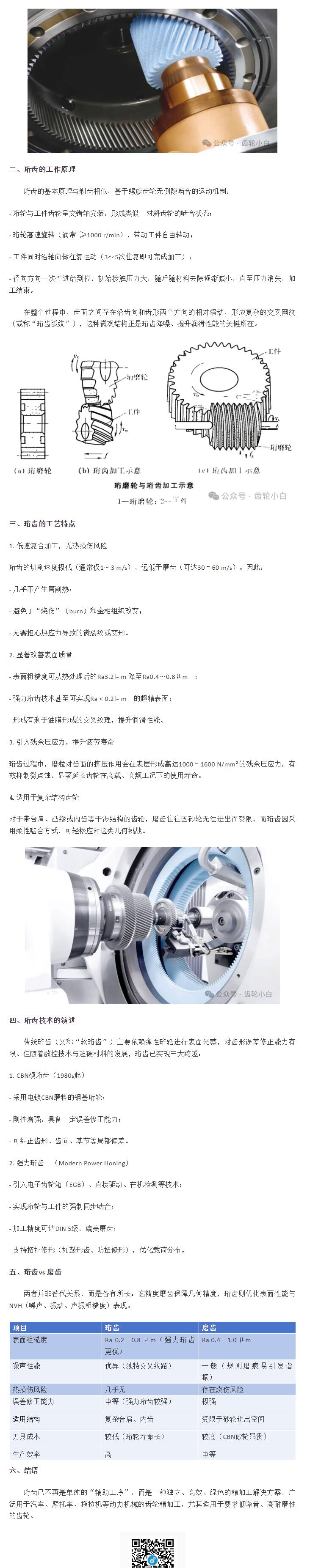 珩齿是一种专门用于淬硬齿轮齿面精整的加工工艺。通俗地说,它就像是给齿轮做一次“齿面美容”——在热处理后去除表面氧化皮、毛刺,并显著改善齿面粗糙度,同时在一定程度上修正微小的几何误差。